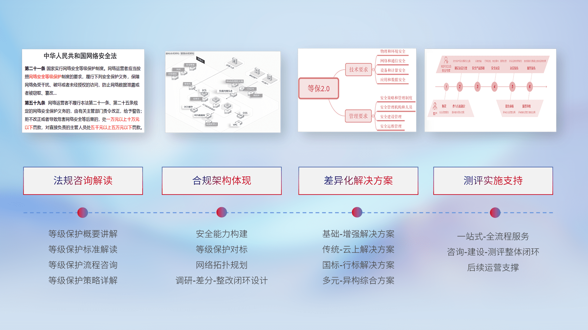 通过专业的法律咨询解读、、、合规架构体现、、、、差异化解决方案、、、测试实施支持等服务,,,,为客户量身打造等保合规体系。。。。